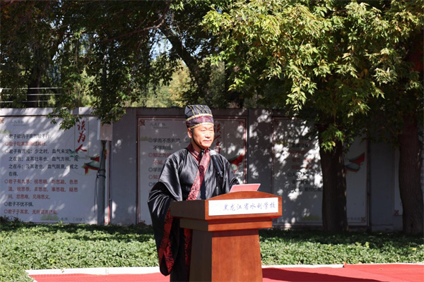 中国孔子基金会大庆孔子学堂推广指导委员会主席、黑龙江省水利学校校长袁峰恭谨致辞。他首先阐述了在新时代传承孔子教育思想与文化精神的重要意义:今日之祭,非为复古,实为溯源;非仅仪轨,更是精神的淬炼与文化的宣誓,彰显我们民族“慎终追远”、继往开来的文化自信与历史自觉。他强调,每一位教育工作者,都当以传承斯文、弘道育人为己任,争做圣贤智慧的虔诚研习者、躬身践行者与积极传播者,将中华优秀传统文化所蕴含的哲学思想、人文精神、价值理念、道德规范,全方位、深层次融入育人全过程,着力培养兼具家国情怀、全球视野与文化底蕴的时代新人。