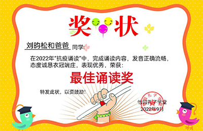 怡园学堂、图书馆学堂负责人,带领大家诵读之前首先感恩黄帝赐予我们的健康理念,护佑炎黄子孙!活动一发起,几十个家庭参与进来,母子诵读、全家共读,通过视频大家一起诵读,既和谐了静默居家期间的亲子关系,又增长了健康养生的正确理念。学堂的志愿者老师们,还从参与诵读的视频当中评选出来9名“最佳诵读奖”,以电子奖状的形式发在微信群里,进行表彰!