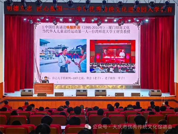 又是一年开学季,当更多入学新生都在参加磨炼意志、强化纪律的军训时,黑龙江省水利学校的学生还迎来了一场传统文化的明德立志教育。 8月21日至8月23日,大庆市优秀传统文化促进会2024年“明德立志 匠心报国”传统文化进校园活动在黑龙江省水利学校报告厅举行。300多名新生、100多位老师及40多名传统文化志愿者参加了三天的培训。