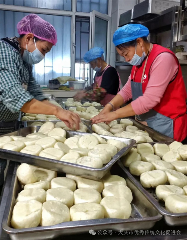 中碳雨花敬老公益餐厅的厨师凌晨2点就起来发面,志愿者们也早早地来到厨房,提前为大集准备。店长田玉华和志愿者们将几百个大包子,满满一大桶姜汤、热热乎乎的八宝粥送到现场,不到一个小时就被赶集的人们尽情分享。