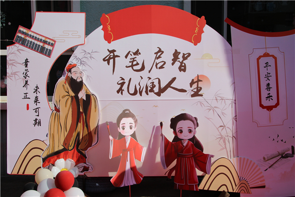 开笔启智,礼润人生。开笔礼是中国古代对少儿识字习礼的一种启蒙教育形式。首先进行的是净手静心正衣冠环节,孩子们有序排队,走到飘着玫瑰花瓣的水盆前面,洗手静心肃正衣冠。《礼记》中说,“衣冠正,则言行端”,这一环节让孩子们懂得先正衣冠后明事理的次第和道理。最后全体人员用儒家最高礼仪---高揖礼,三拜大成至圣先师孔子。