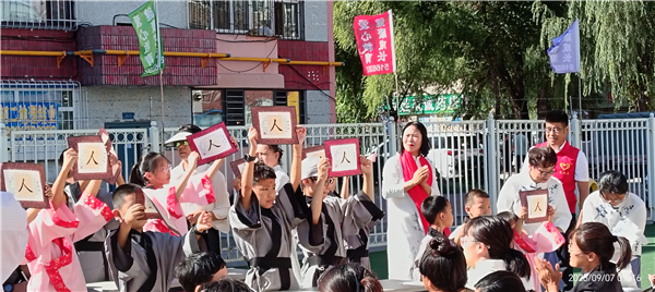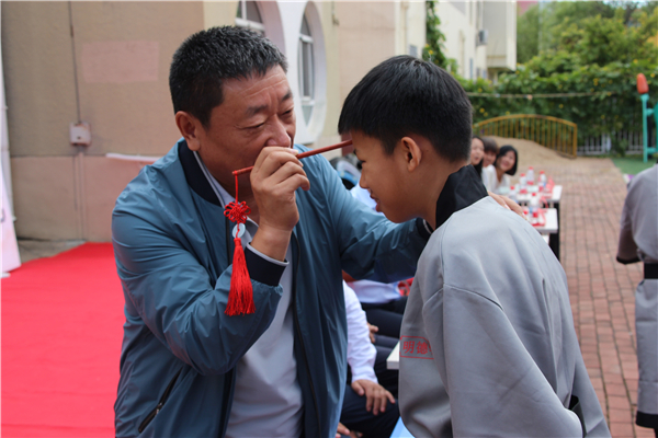 “朱砂点志”是中国传统开笔礼的重要环节,黑龙江省水利学校党委书记王春雨、大庆市优秀传统文化促进会副会长汪景波、爱心企业家代表张志军等各位嘉宾拿起朱砂笔,点在孩子们的眉心,寓意打开智慧的大门,让孩子们明辨是非、勤学好学,学业有成。